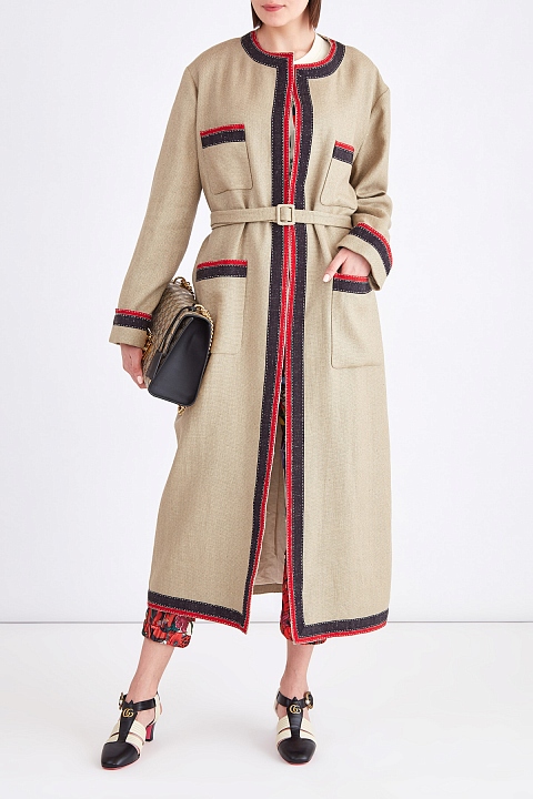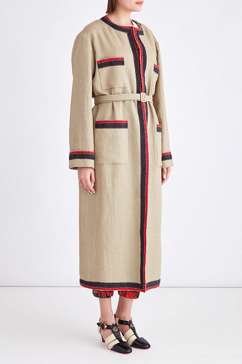 Стильный женский плащ из весенне-летней коллекции Gucci прямого кроя, созданный из плотной ткани в составе льна и хлопка с переплетением «рогожка» натурального песочного оттенка. Фирменный стиль прослеживается во вставках в гамме Web на отделке центральной планки, нижней кромки, круглого ворота, манжет и окантовке накладных карманах на груди и по бокам. Талию подчеркивает текстильный пояс в тон. Сделано в Италии.