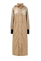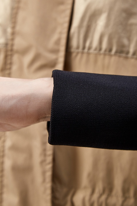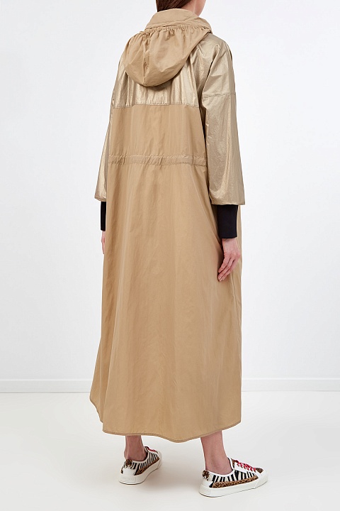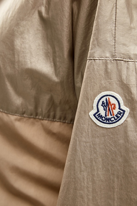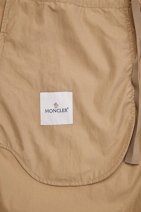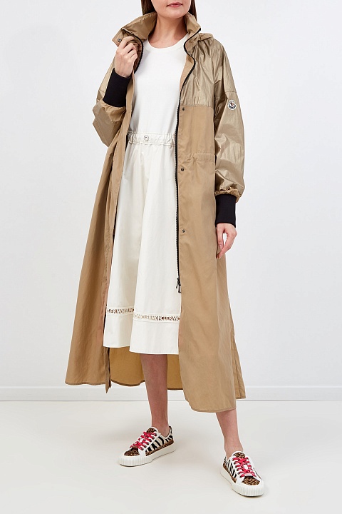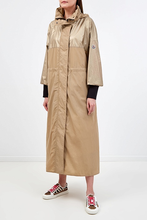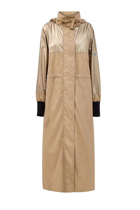 Плащ от Moncler сочетает два вида ткани — легкий и прочный нейлон с золотистым напылением и матовый габардин оттенка camel. Свободный крой-трапеция идеально подходит для создания многослойных образов, а кулиска по линии талии позволяет индивидуально отрегулировать силуэт. Высокие эластичные манжеты обеспечивают плотную посадку. Капюшон можно спрятать внутрь ворота-стойки с объемной монограммой в тон. Детали: двойная линия застежки, легкая конструкция без подкладки.