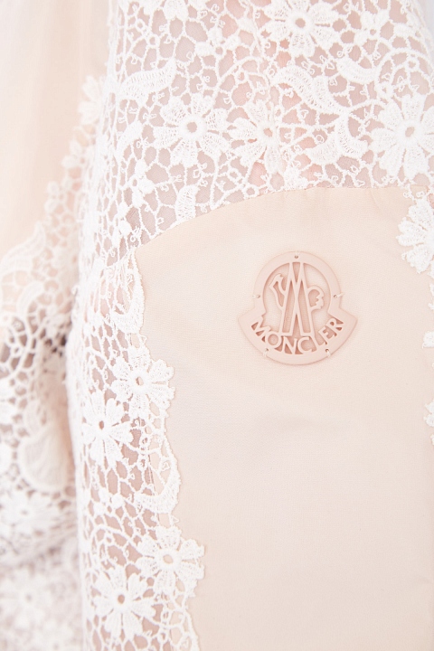 Легкий женский плащ «Saute» из весенне-летней коллекции Moncler выполнен из воздушной и плотной хлопковой тафты в нежно-розовом оттенке. Модель декорирована вставками из хлопкового кружева с цветочным мотивом. Кулиска на поясе позволяет создать приталенный силуэт, а объемные рукава, собранные книзу, обеспечивают плотную посадку по фигуре и защищают от ветра. Круглый вырез горловины и ажурная нижняя кромка завершают образ в романтическом стиле. Изделие оснащено застежкой-молнией.