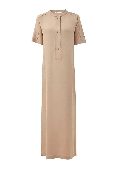 Лаконичное платье-рубашка длины макси от Agnona выполнено из итальянской шерстяной ткани. Фурнитура с золотистым напылением подчеркивает универсальный оттенок camel. Атласная внутренняя поверхность обеспечивает максимальный комфорт в течение всего дня. Объемный крой-oversize цельнокроеными рукавами и разрезами в боковых швах дополнен элегантным воротником-стойкой с застежкой на кнопки. Детали: прорезные карманы по бокам, длина по спинке 127 см. Сделано в Италии.