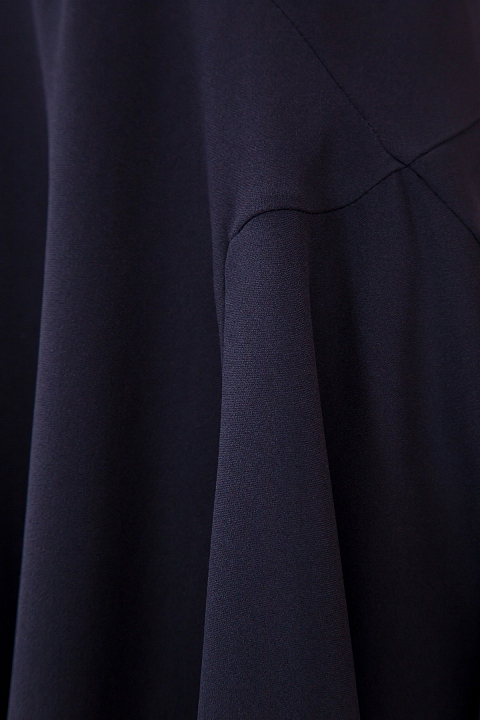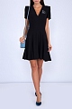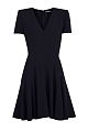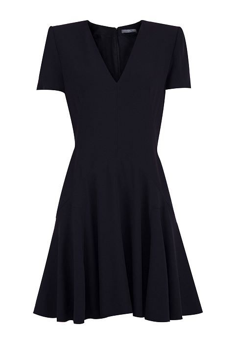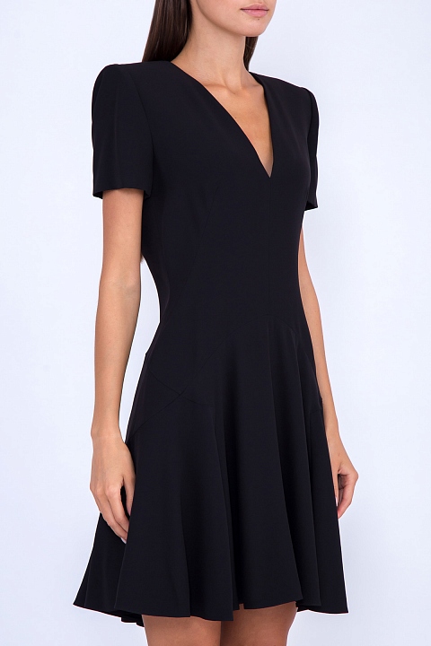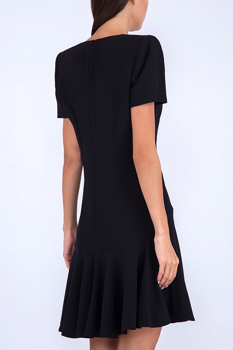 Лаконичное платье-мини из коллекции Alexander McQueen. Модель приталенного кроя выполнена из плотной вискозы с добавлением ацетатного шелка черного цвета. Особенностью изделия является силуэт лифа с массивным кроем плеча и глубоким V-образным вырезом. Платье с короткими рукавами и мягкими оборками на подоле. Сделано в Италии.