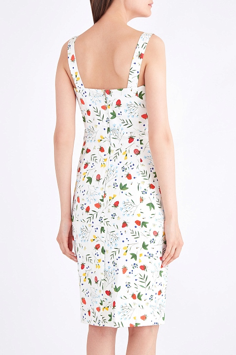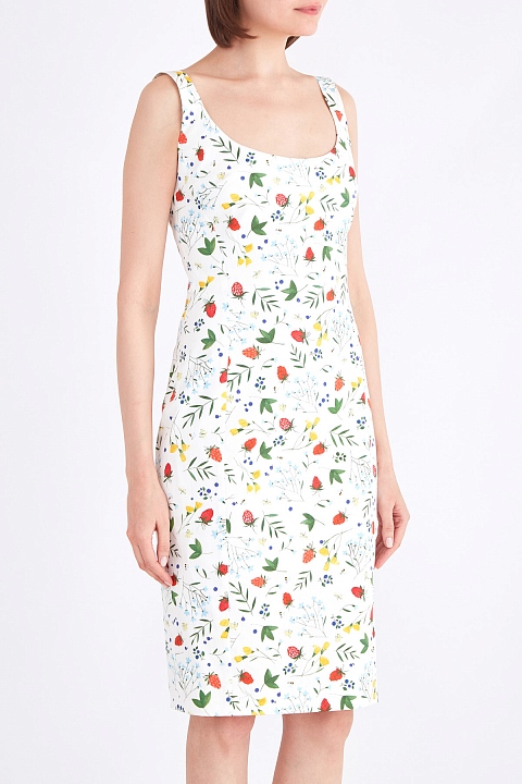 Яркое платье из круизной коллекции бренда Alexander Terekhov выполнено из эластичного хлопка белоснежного тона с декором эффектным набивным принтом с флористической тематикой. Модель с глубоким круглым вырезом проймы горловины и декольтированной спинкой оснащена широкими бретелями, которые привносят в образ элементы спортивного стиля. Изделие с вытачками и шлицей для посадки по фигуре оснащено застежкой-молнией. Сделано в России.