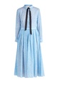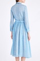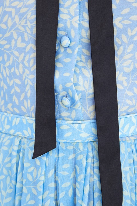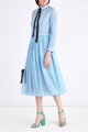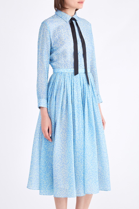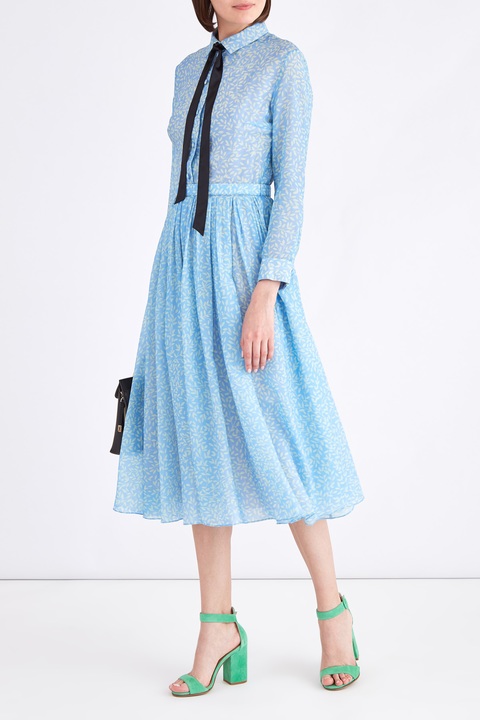 Эффектное платье длины миди из весенне-летней коллекции Alexander Terekhov выполнено из нежного шелка и легкой шерсти в ярком лазурном оттенке с набивным принтом на флористическую тематику белоснежного тона. Элегантный образ создают манжеты на рукавах длины ¾, застежка на пуговицы и аккуратный отложной воротник с контрастными бархатными лентами черного цвета, которые образуют изящный бант. Пышная юбка с заложенными складками завершает изделие. Сделано в России.