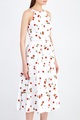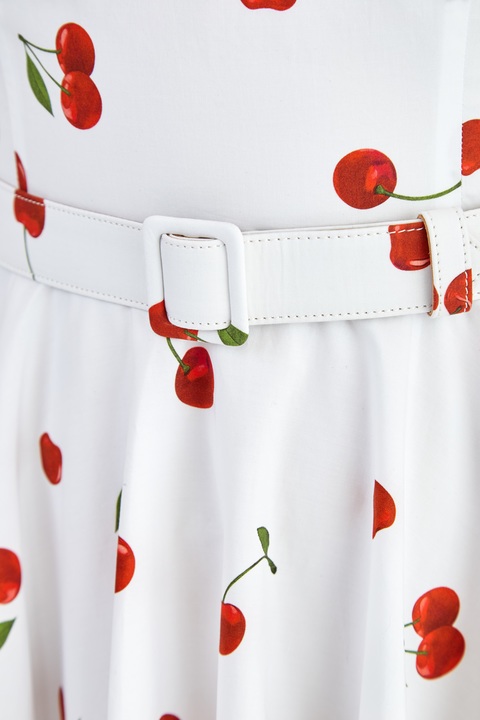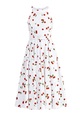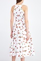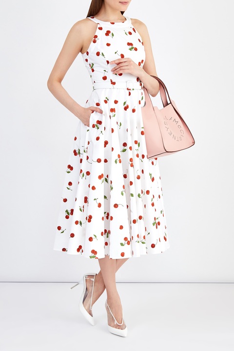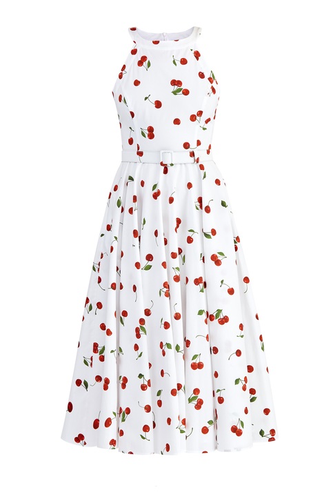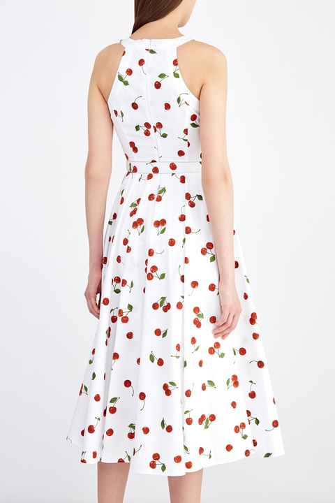 Приталенное платье в стиле эпохи 70-х от Alexander Terekhov выполнено из плотного, держащего форму хлопкового поплина белоснежного цвета с ярким набивным принтом. Лиф с американской проймой без рукавов с широкой окантовкой по кромкам, отрезной расклешенный подол дополнен присборенной отделкой по линии талии. Детали: потайная застежка на спинке, широкий кожаный ремень с тканевым покрытием в тон.
