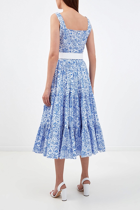 Романтичное платье-сарафан от Alexander Terekhov создано из дышащего хлопка с флористическим принтом по всей поверхности. Натуральный материал в белых и синих тонах обеспечивает максимальный комфорт и идеально подходит для летних аутфитов. Расслабленный силуэт без рукавов дополнен съемным ремнем из кожи в белоснежном оттенке. Архитектурный плиссированный подол завершает дизайн. Детали: застежка на потайную молнию на спинке, подкладка из эластичной ткани.