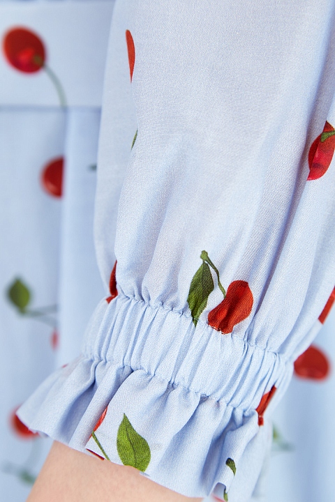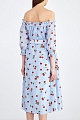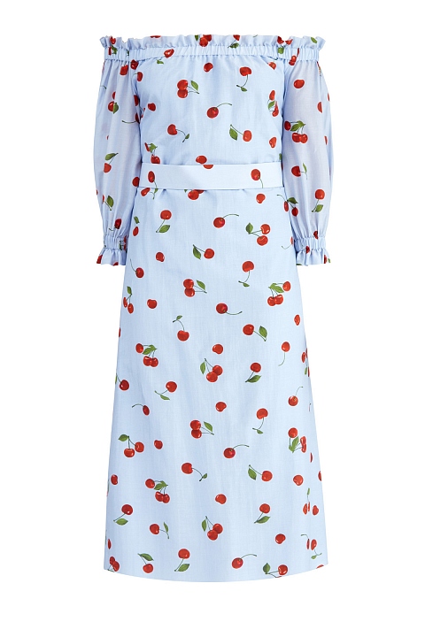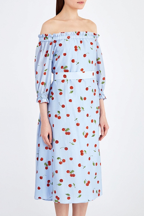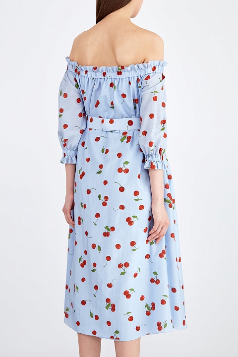 Яркое платье от Alexander Terekhov выполнено из воздушного хлопкового муслина с добавлением волокон шелка в голубом оттенке с ярким набивным принтом. Лиф с вырезом «кармен» дополнен эластичной вставкой, которая создает объемные оборки и перекликается с отделкой кромок рукавов. Внутренняя подкладка из хлопка формирует пышный силуэт. Съемный ремень из кожи с тканевой поверхностью завершает дизайн.