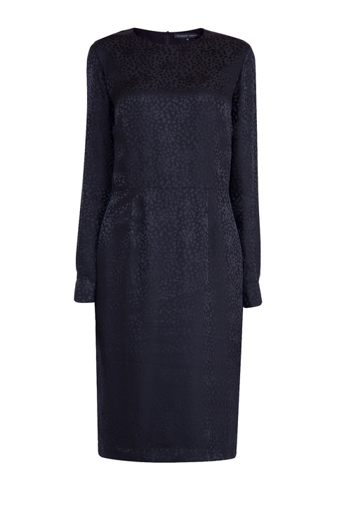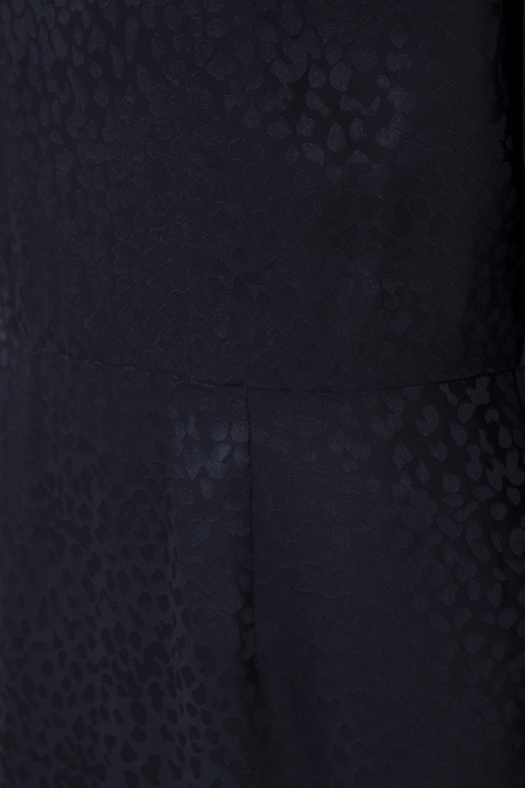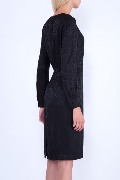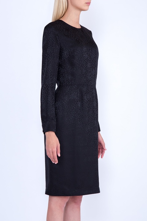 Элегантное платье приталенного силуэта из коллекции Alexander Terekhov. Модель выполнена из шелка черного цвета с фактурным повторяющимся узором. Изделие с круглым вырезом горловины, длинными рукавами с манжетами на пуговицах и шлицей на подоле. Сделано в России.
