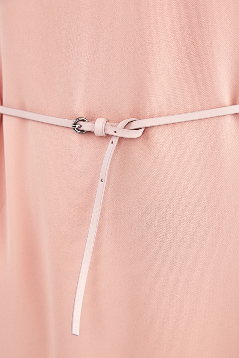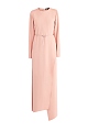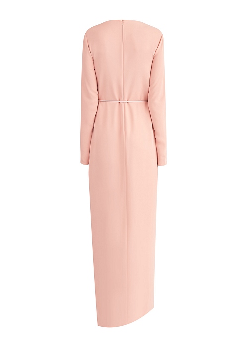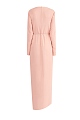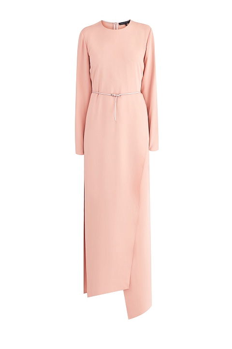 Лаконичное вечернее платье в пол от Alexander Terekhov выполнено из плотной струящейся ткани нежного персикового тона. Тонкий кожаный ремень формирует приталенный силуэт, вытачки обеспечивают посадку по фигуре. Детали: длинные рукава, круглая пройма горловины, застежка на потайную молнию на спинке, асимметричный подол с разрезами.