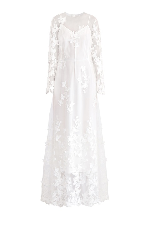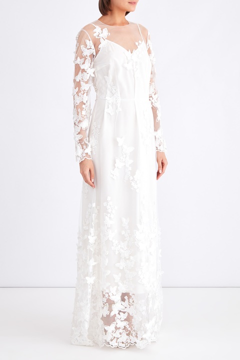 Утонченное платье в пол из весенне-летней коллекции A La Russe создано из воздушной вуали белоснежного оттенка. Расшитая декоративными бабочками поверхность и фигурные кромки подола и длинных рукавов формируют элегантный и женственный образ. Внутренний слой выполнен из вискозного платья-комбинации длины миди с V-образным вырезом декольте и тонкими регулируемыми бретелями в тон. Сделано в России.