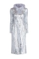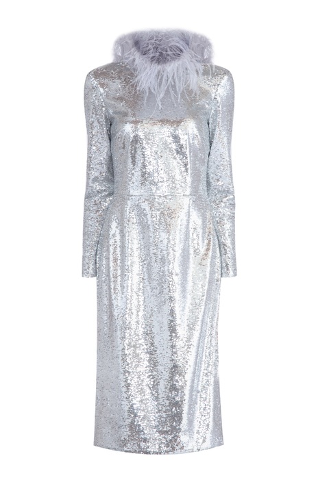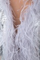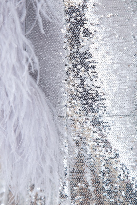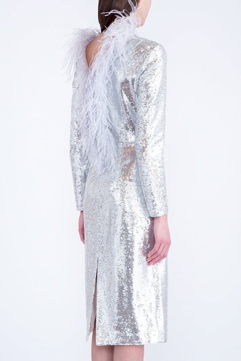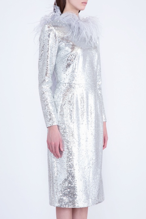 Платье с серебристыми пайетками и воротом с перьями страуса