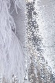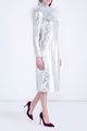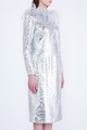 Эффектное коктейльное платье A La Russe приталенного кроя. Модель выполнена из ткани, полностью расшитой серебристыми пайетками. Изделие с длинными рукавами и круглым воротом, переходящим в глубокий вырез на спинке, украшенный невесомыми перьями страуса, отсылающими к образу мифической птице счастья — Благовест, ставшей центральным персонажем коллекции. Сделано в России.