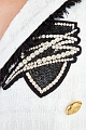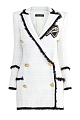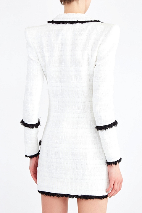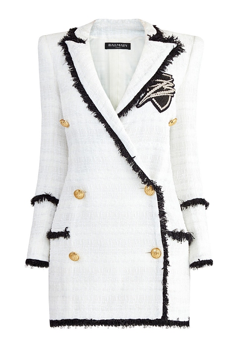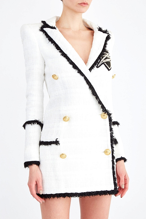 Платье-блейзер от Balmain из плотного твида с характерной плетеной фактурой. Лаконичный молочно-белый оттенок дополнен вплетенными в материал полупрозрачными пайетками и мерцающей нитью люрекса. Универсальный удлиненный крой позволяет носить модель в качестве верхнего слоя или как платье. Передняя планка дополнена аппликацией, вручную расшитой стеклярусом и кристаллами. Детали: двубортная застежка на фирменные пуговицы, контрастная отделка кромок, подкладка.
