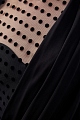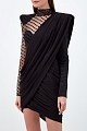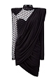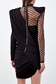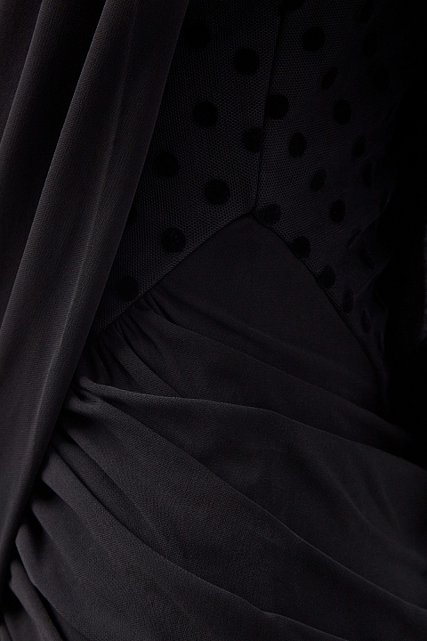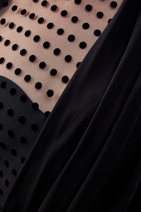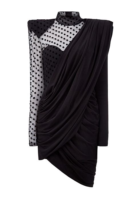 Вечернее от Balmain из вуали с бархатным принтом в горох «плюмти». Контраст фактур создает вставка из джерси — материал с эффектом моделирования силуэта привносит в образ нотку фирменного дерзкого стиля. Высокий ворот и четко очерченная линия плеч формируют культовый силуэт. Детали: застежка на массивную молнию на спинке, внутри корсетное платье-бандо. Длина изделия 75 см.