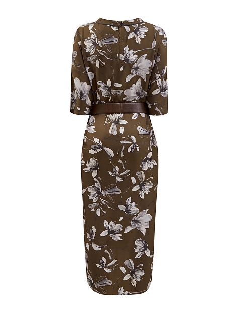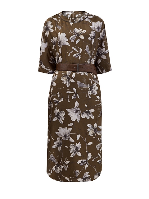 Изысканное платье-миди от Brunello Cucinelli полностью создано из шелкового твила. Струящаяся ткань на основе ценных волокон отличается гладкостью и легким глянцевым блеском. Модель в оттенке темного шоколада дополнена принтом Ramage Print с лиственным мотивом. Широкий съемный ремень из кожи позволяет визуально моделировать силуэт, отделка шлевки и воротника цепочками Мониль подчеркивает присущую бренду элегантность. Детали: прорезные карманы, круглый вырез горловины, застежка на молнию на спинке, разрезы по нижнему краю. Сделано в Италии.