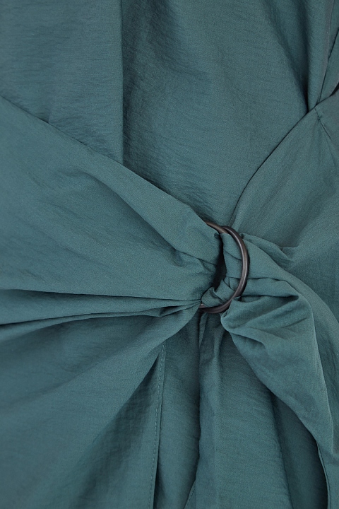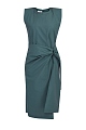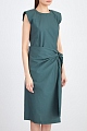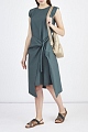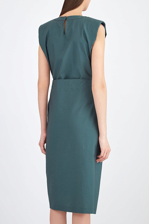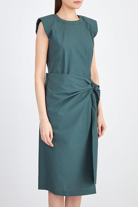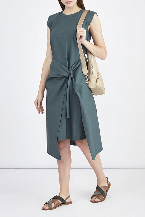Стильное платье-футляр от Brunello Cucinelli создано из легкого хлопкового поплина в приглушенном сине-зеленом оттенке. Волокно нейлона в составе ткани придает поверхности воздушную и слегка неоднородную текстуру. Эффектный образ создает подол кроя на запах с металлическими фиксаторами. Изделие без рукавов дополнено цепочкой мониль по кромке горловины и геометрическими срезами пройм. Сделано в Италии.