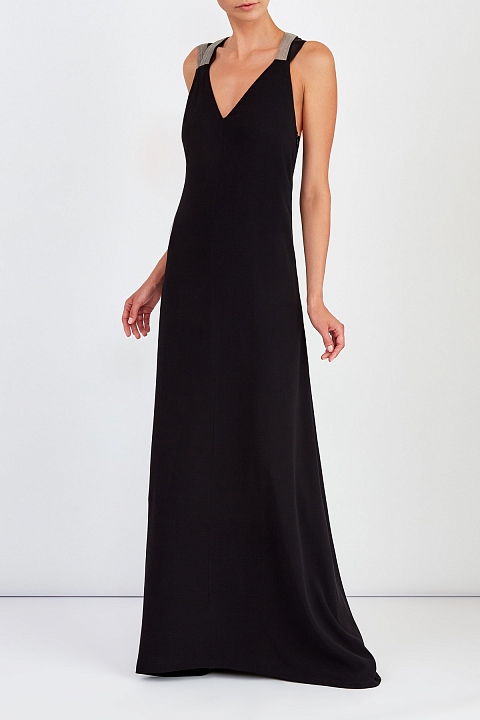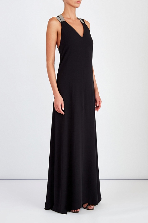 Вечернее платье в пол от Brunello Cucinelli создано из натурального шелка. Мягкая ткань струится по фигуре, создавая изящный силуэт. Перехлест оформляет декольтированную спинку широкими бретелями, которые расшиты сверкающими бусинами Мониль. V-образный вырез символизирует утонченность и вкус. Подкладка, выполненная из материала с добавлением шелка, позволяет избежать деформации. Сделано в Италии