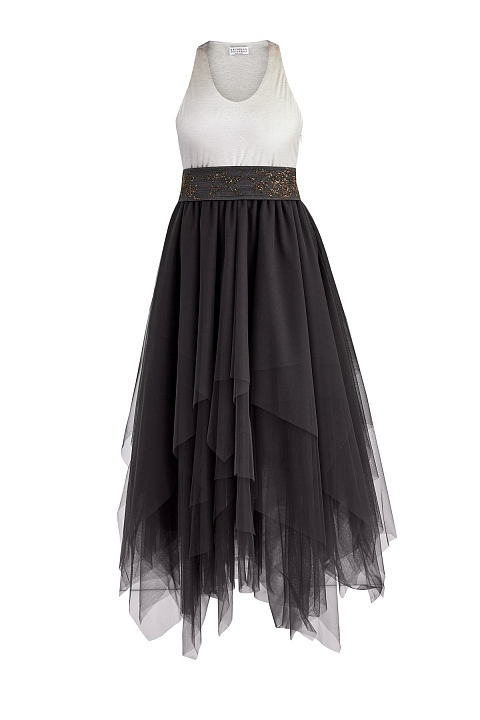 Мерцающее платье от Brunello Cucinelli. Широкий притачной пояс с отделкой ручной работы из цепочки Мониль и бисера формирует изящный силуэт. Вуалевая многослойная юбка цвета мокко выполнена с добавлением нитей люрекса с эффектом сияния. Топ оттенка слоновой кости с серебристым напылением создает мягкие световые переливы. Модель с U-образным вырезом, без рукавов. Сделано в Италии.