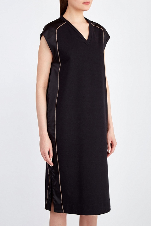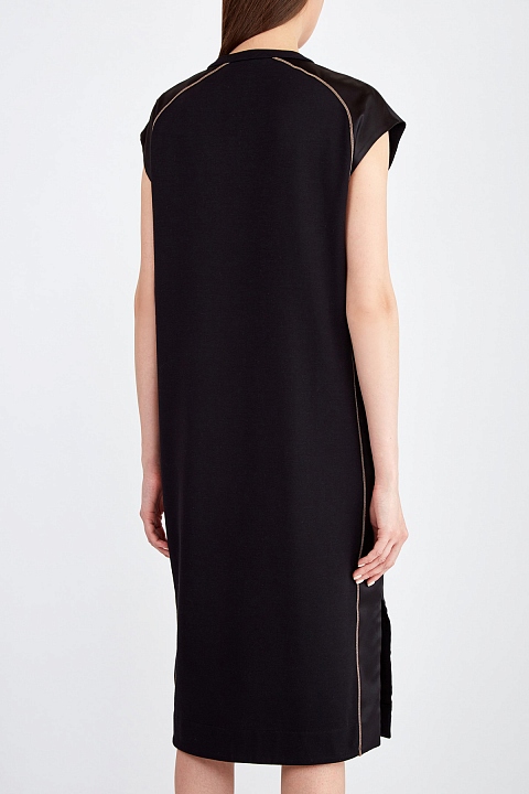 Платье прямого кроя от Brunello Cucinelli выполнено из мягкого хлопкового джерси в элегантном черном цвете. Однородные, идентичные волокна собранного вручную хлопка позволяют получить гладкую поверхность ткани. Изящный образ в стиле спортшик создают лампасы из атласа в тон с выполненной вручную отделкой из цепочек Мониль по кромкам. Изделие без рукавов дополнено лаконичным V-образным вырезом декольте. Сделано в Италии.