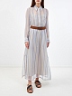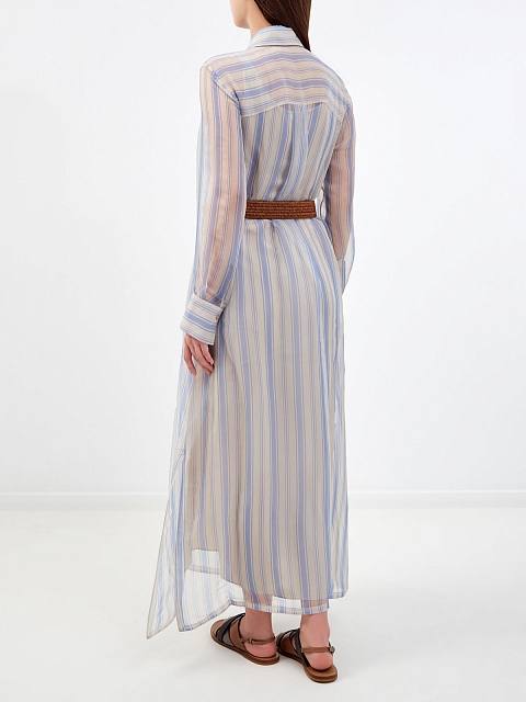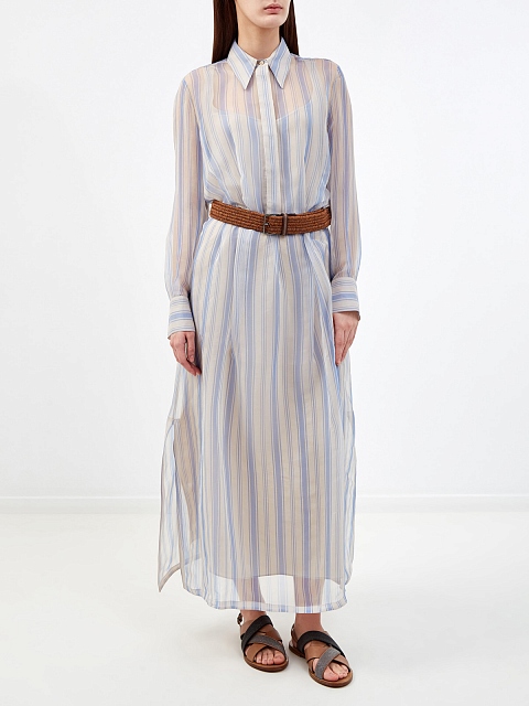 Длинное платье-рубашка от Brunello Cucinelli создано из легкого шелкового шифона. Струящийся материал с лаконичным принтом в полоску и полностью натуральным составом подчеркивает расслабленные линия кроя. Плетеный ремень Rustic с отделкой цепочками Мониль придают изделию легкий акцент в стиле western. Подкладка из шелкового крепа завершает элегантный дизайн. Сделано в Италии.