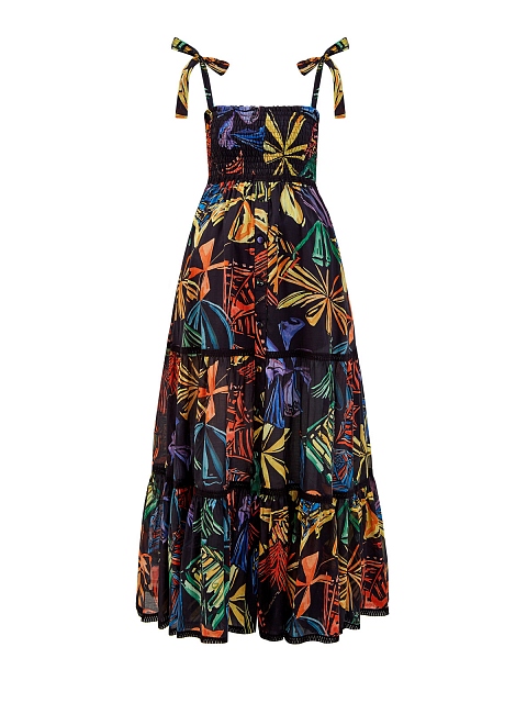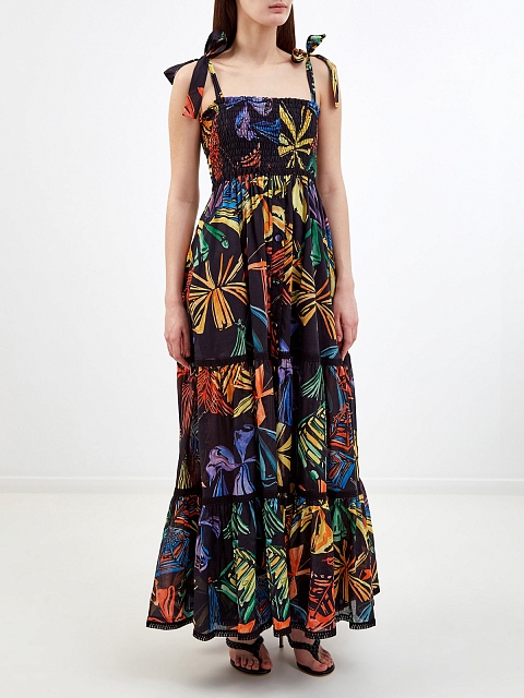 Длинное платье Artemisa из круизной коллекции Ritmo от Charo Ruiz Ibiza идеально подходит для пляжных и городских образов. Модель можно носить полностью застегнутой, или расстегнутой — с шортами и бикини. Эластичный лиф с бретелями на завязках обеспечивает комфортную посадку по фигуре. Детали: тропический принт, застежка на пуговицы, ажурная вышивка.