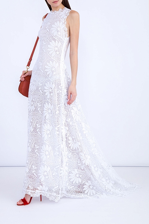 Эффектное платье Charo Ruiz Ibiza приталенного силуэта изготовлено из цветочного фирменного кружева ручной работы, украшающего всю поверхность. Модель с открытыми проймами и круглым вырезом горловины. Длинная юбка-макси расклешенного кроя с подолом и прозрачная спинка идеально завершают образ.