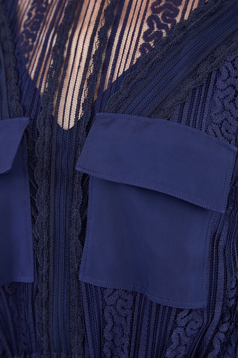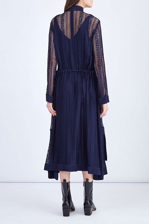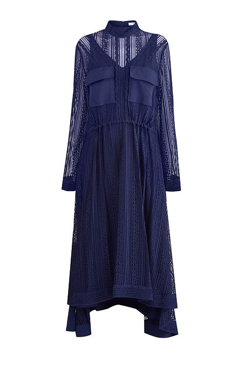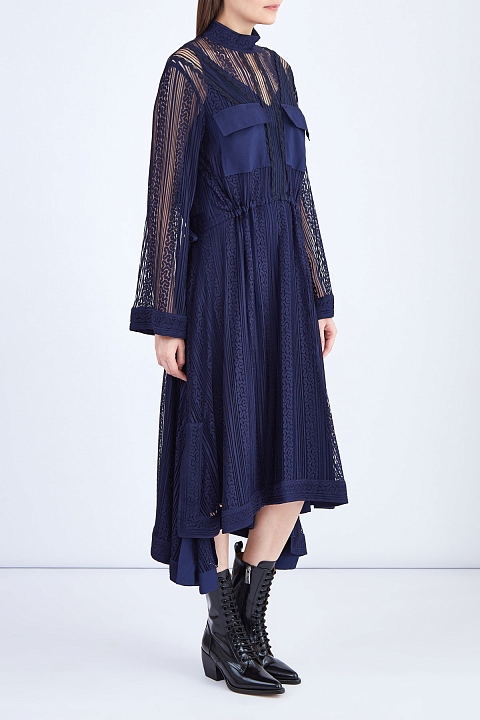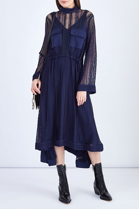 Летящее платье-миди из коллекции осень-зима от Chloe создано из вуали с кружевной отделкой в густом синем цвете. Потайная кулиска по линии талии образует приталенный силуэт, а также эффектно драпирует ткань. Модель дополнена накладными карманами с клапанами в стиле карго из вискозы и высоким воротом и расклешенными книзу рукавами. Внутреннее платье-комбинация из струящегося шелка в тон обеспечивает посадку по фигуре, асимметричный срез подола завершает дизайн.