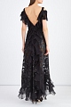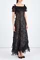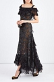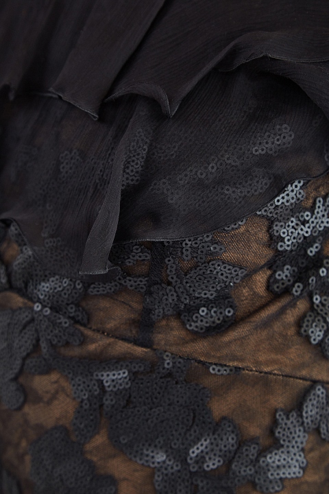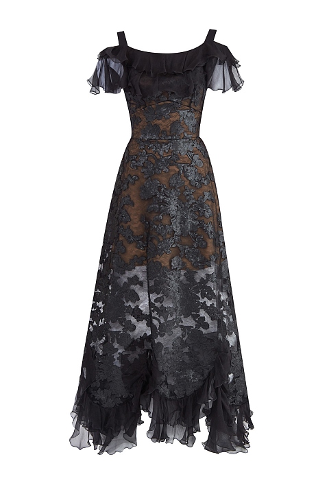 Эффектное вечернее платье из коллекции Elie Saab приталенного кроя с открытыми плечами на широких бретелях с мягкими оборками на лифе, перекликающимися с воланами ниспадающими по подолу на асимметричную кромку. Модель создана из прозрачной гипюровой ткани черного цвета с ремесленной вышивкой пайетками с цветочным орнаментом по всей поверхности. Комфорт во время носки обеспечивает внутренняя подкладка телесного тона. Сделано в Италии.