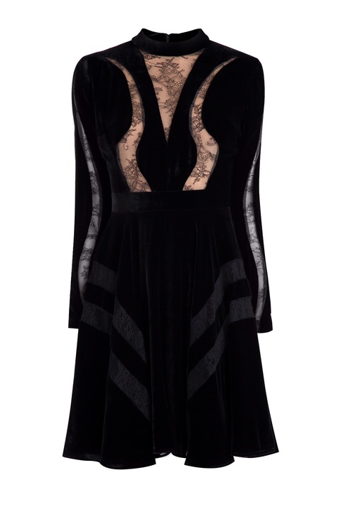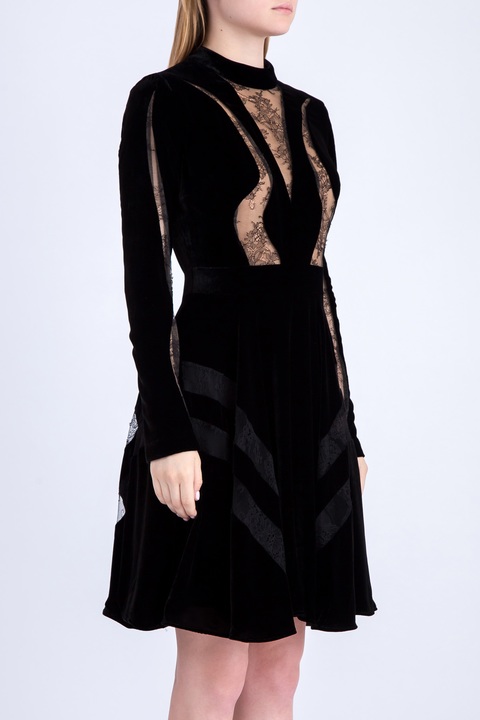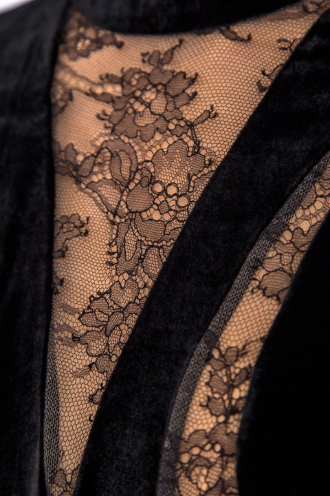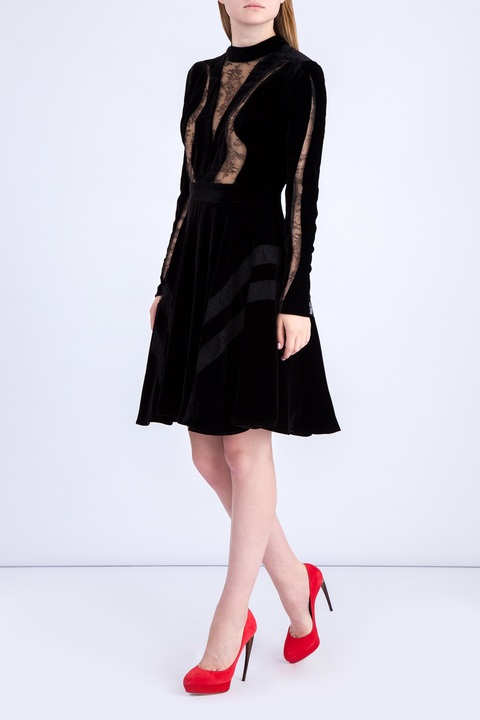Платье Elie Saab, характеризующееся утонченным кроем, подчеркивающим женственный силуэт. Модель сшита из смесового шелка с мягкой бархатной поверхностью глубокого черного цвета. Полупрозрачные кружевные вставки в тон на лифе, подоле и рукавах дополняют эффектный вечерний образ. Сделано в Италии.