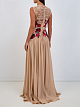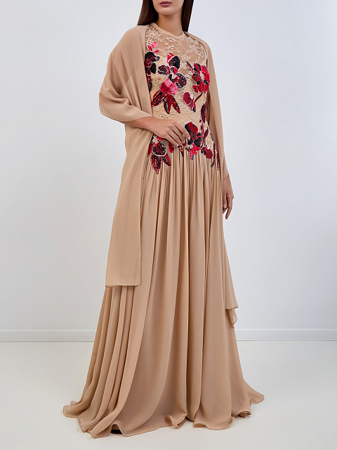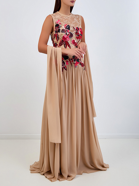 Расшитое вручную платье из тюля и шелка от Elie Saab олицетворяет элегантность, неподвластную времени. Лиф прямого кроя с кружевной вышивкой и цветочной отделкой из пайеток переливается замысловатыми деталями, а расклешенная юбка легко ниспадает каскадом до пола. Дополняющий платье шелковый шарф создает дополнительный драматический эффект, что делает его идеальным выбором для вечерних мероприятий.