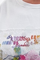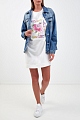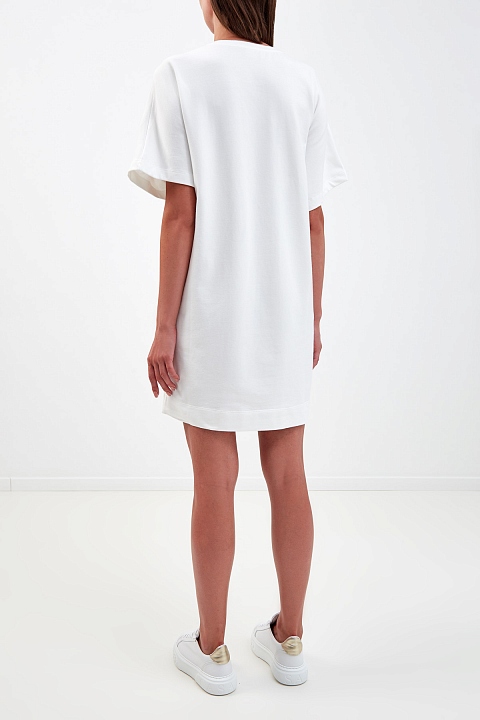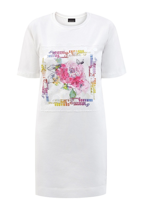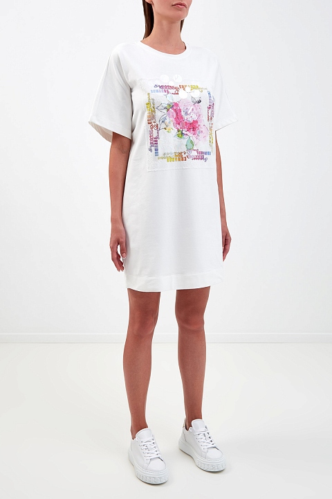 Платье-футболка прямого кроя от Ermanno Ermanno Scervino выполнено из гладкого хлопкового футера в базовом белом цвете. Эластичные волокна в составе изделия и фактурная внутренняя поверхность обеспечивают максимальный комфорт. Модель украшена яркой макро-аппликация с отделкой из кружева и декоративными круглыми вставками из прозрачного полимера. Детали: короткие рукава, круглый вырез горловины.