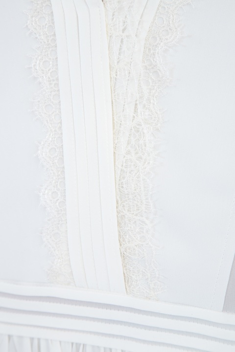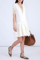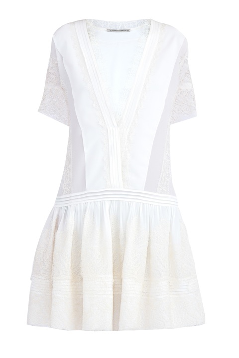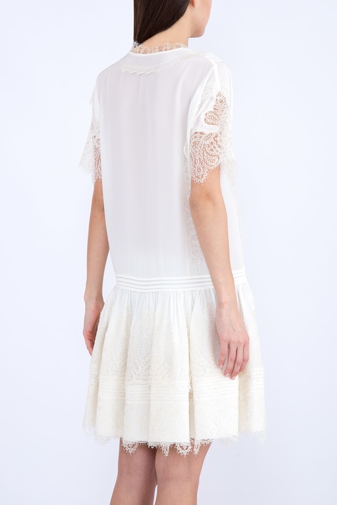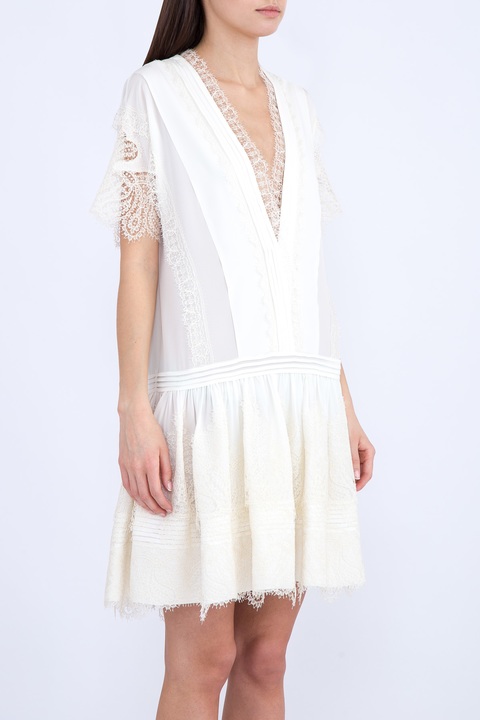 Платье Ermanno Scervino создано в стилистике бохо-шика. Модель свободного кроя характеризуется тончайшим кружевом по всей поверхности, глубоким V-образным декольте и подолом, украшенными оборкой. Завершают образ резные рукава «реглан» и мини-юбка со множеством плавных складок. Сделано в Италии.