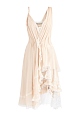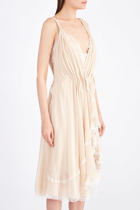 Изящное платье из коллекции бренда Ermanno Scervino замысловатого деструктурированного кроя, образованного за счет нескольких слоев струящегося шелка кремового цвета, множества драпировок, ниспадающих мягкими складками, асимметричных бретелей и кромок подола. Летящий невесомый образ подчеркивает отделка полупрозрачными паутинками кружева. Сделано в Италии.