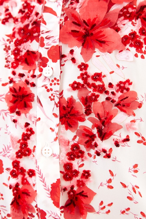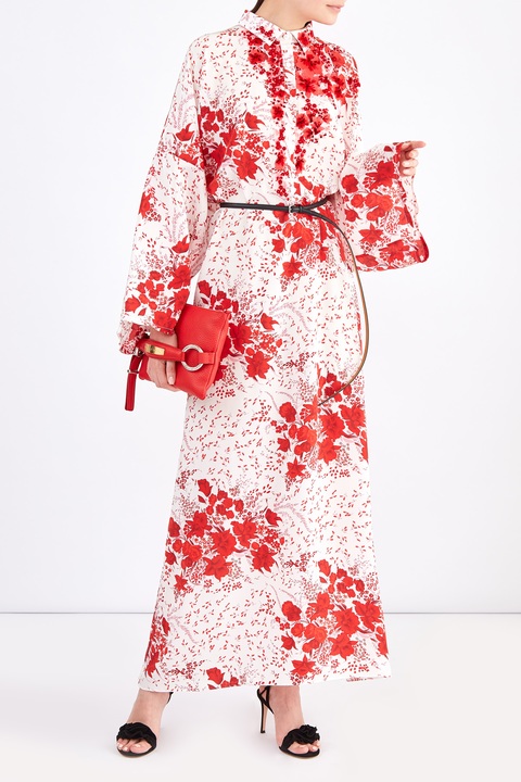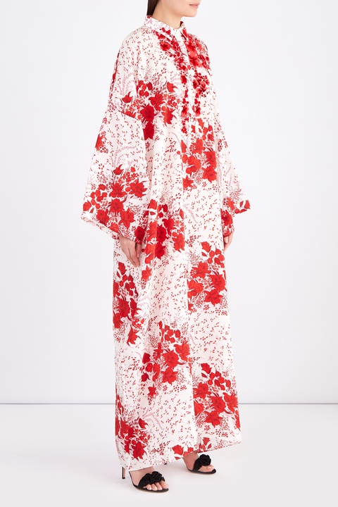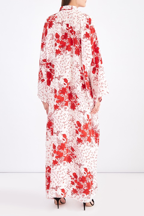 Эффектное платье длины макси из весенне-летней коллекции Ermanno Scervino свободного кроя. Модель создана из струящегося матового шелка белого цвета с изящным цветочным рисунком в алых тонах, который создает нежный романтический образ. Изделие характеризуется широкими рукавами в стиле кимоно и аккуратным отложным итальянским воротом, от которого спускается планка с пуговицами. Сделано в Италии.