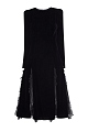 Платье А-силуэта длины миди от Ermanno Scervino выполнено из гладкого бархата черного цвета, однотонное исполнение подчеркивает богатую текстуру материала. Изделие дополнено вставками из плиссированного ажурного кружева с цветочным мотивом по подолу для достижения контрастного эффекта. Детали: четко очерченная линия плеч, круглая пройма горловины, потайная застежка-молния на спинке. Сделано в Италии.