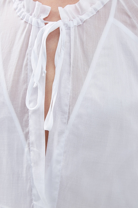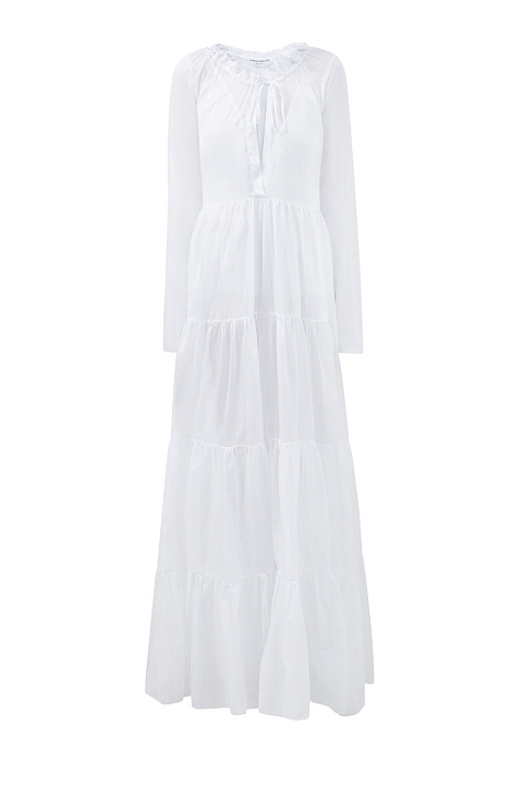Воздушное платье от Ermanno Scervino выполнено из хлопкового муслина в белом цвете. Полупрозрачная ткань и полностью натуральный материал делают модель идеальной для составления летних образов. Нотки расслабленного в стиля бохо вносят присборенный воротник с кулиской и пышный ярусный подол. Детали: съемная внутренняя комбинация, длинные рукава-реглан. Сделано в Италии.