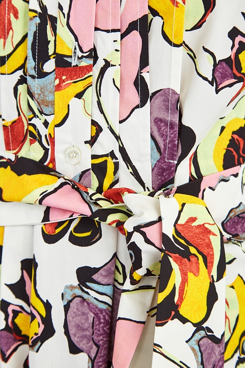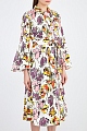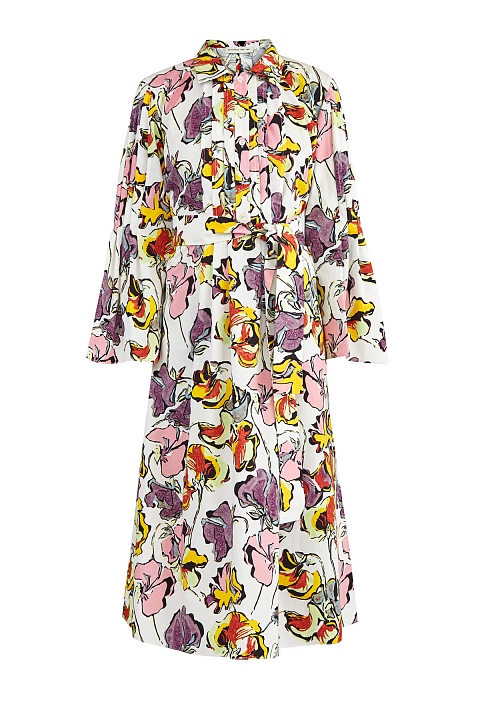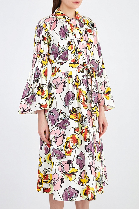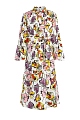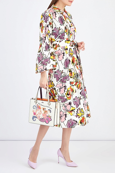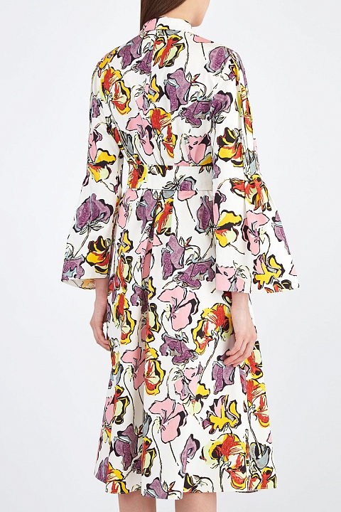 Яркое платье-миди из круизной коллекции от Etro выполнено из плотного, держащего форму хлопка. Флористический набивной принт, украшающий всю поверхность изделия, был вдохновлен романом Иена Макьюена «The Daydreamer». Романтический образ создают расклешенные манжеты, а также заложенные складки на рукавах и передней планке. Детали: широкий пояс-лента, отложной воротник, застежка на пуговицы. Сделано в Италии.