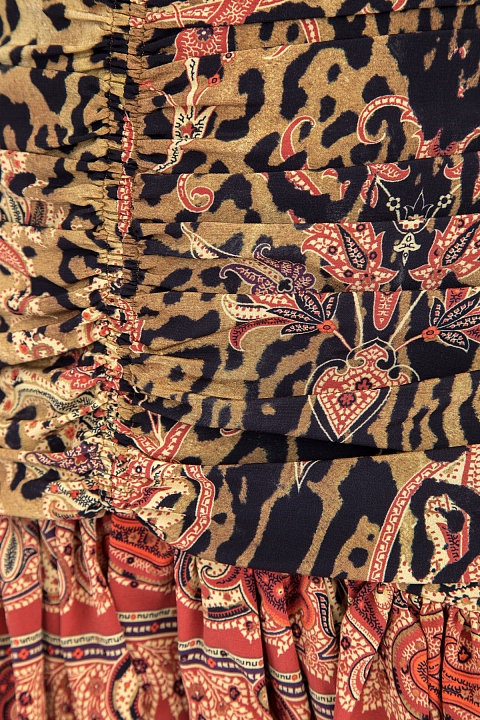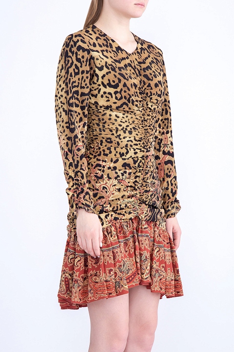 Эффектное платье Etro с заниженной линией талии и множеством драпировок. Модель выполнена из нежного шелка, украшенного двумя активными принтами: леопардовым и интерпретированным фирменным орнаментом "пейсли". Изделие с длинными рукавами, круглым воротом и застежкой-молнией в центральном шве спинки. Сделано в Италии.