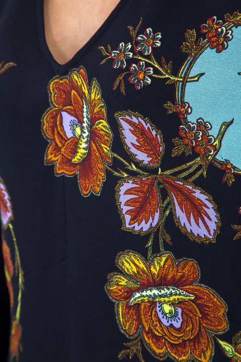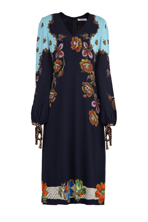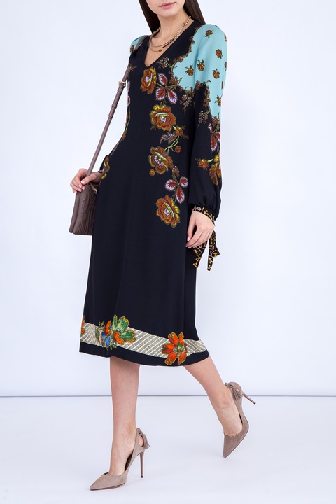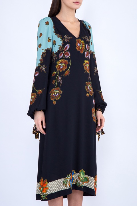 Лаконичное платье Etro свободного кроя, выполненное из эластичной вискозы черного цвета, украшенной светло-голубыми вставками, цветочными узорами и орнаментом на нижней кромке. Модель характеризуется неглубоким V-образным вырезом и длинными рукавами с манжетами на завязках. Застежка-молния вшита в центральный шов спинки. Сделано в Италии.