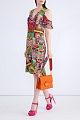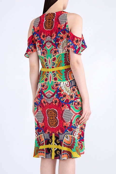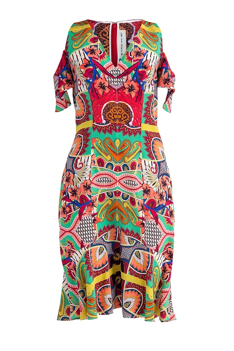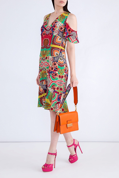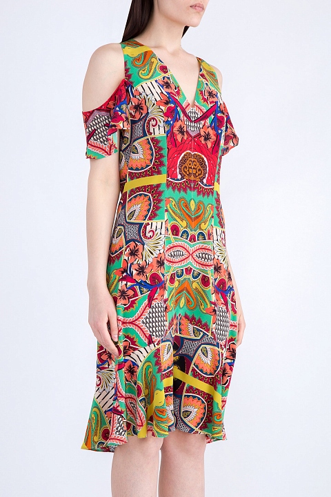 Яркое платье Etro приталенного кроя, выполненное из легкого шелка. Модель с глубоким V-образным вырезом, открытыми плечами, подчеркнутыми асимметричными рукавами с мягкими складками. Особенностью изделия стал яркий орнамент с этно-мотивами в теплой гамме по всему полотну и оборка на нижней кромке, почеркивающая женственный приталенный силуэт. Сделано в Италии.