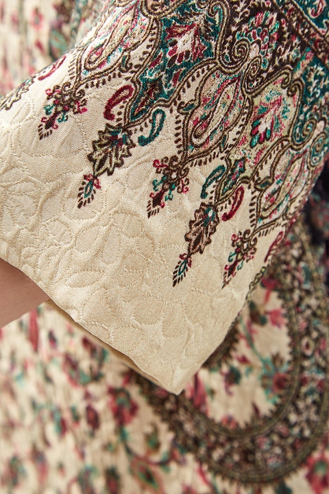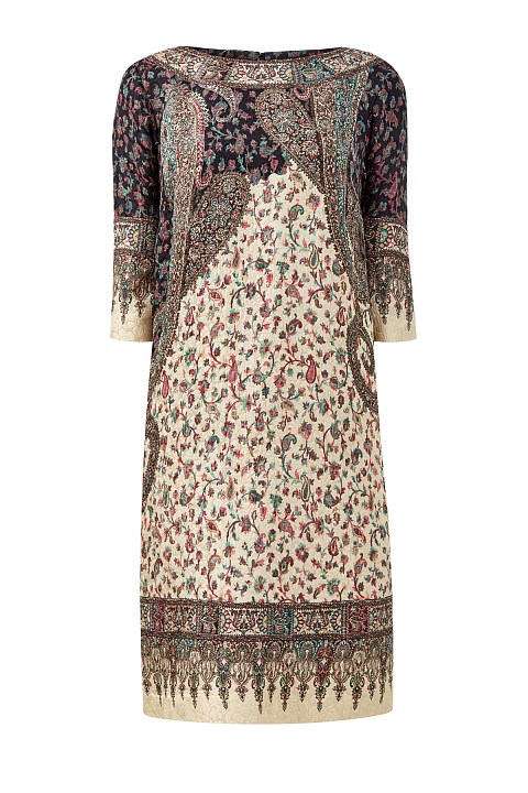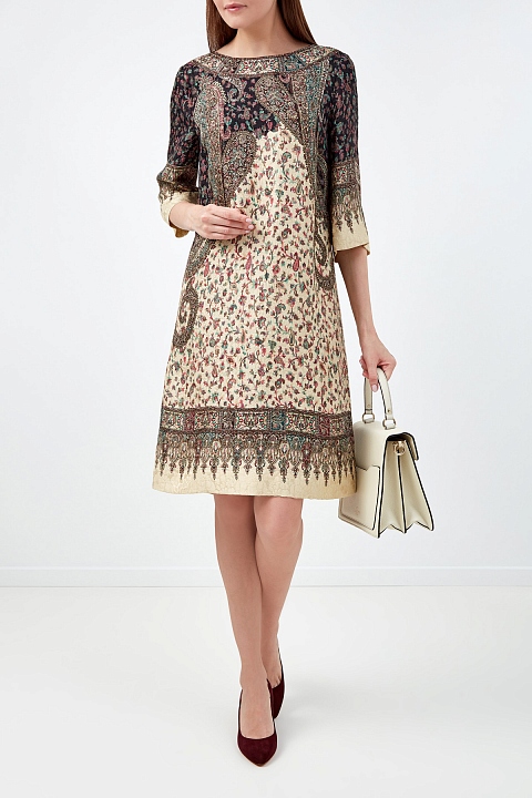 Платье А-силуэта от Etro выполнено из плотной жаккардовой ткани на основе шерсти и шелка. Объемная фактура материала подчеркивает золотистый оттенок. Принт с фирменным этническим мотивом разработан специально для каждого из элементов кроя и нанесен методом печати. Детали: модель без подкладки, застежка-молния. Сделано в Италии.