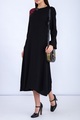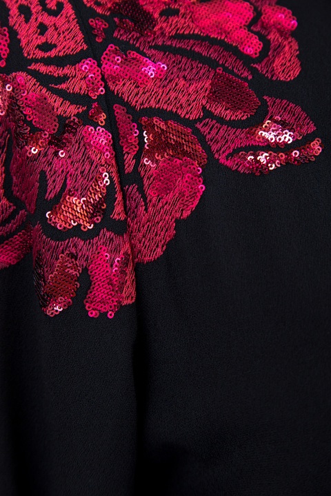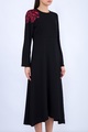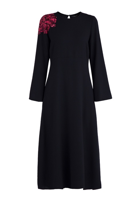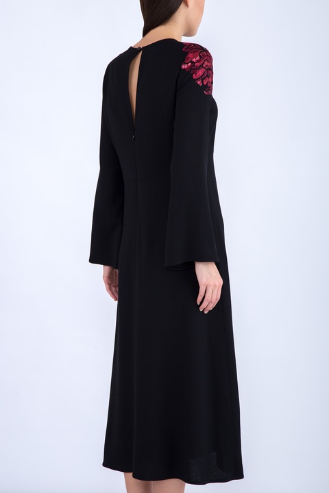 Элегантное платье Etro приталенного кроя, выполненное их легкой вискозы черного цвета. Модель с длинными рукавами и расклешенной юбкой с мягкими драпировками. Изделие украшает эффектная цветочная вышивка из нитей и страз алого цвета, выгодно выделяющаяся на темном фоне. Сделано в Италии.