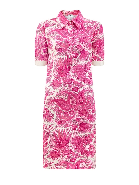 Платье-рубашка в расслабленном стиле от Etro выполнено из держащего форму хлопкового пике. Свободный крой с эластичными манжетами и свойства натурального материала делают модель идеальной для составления летних образов. Изделие в молочном оттенке декорировано принтом пейсли в розовой гамме. Детали: отложной воротник, застежка на пуговицы из перламутра.