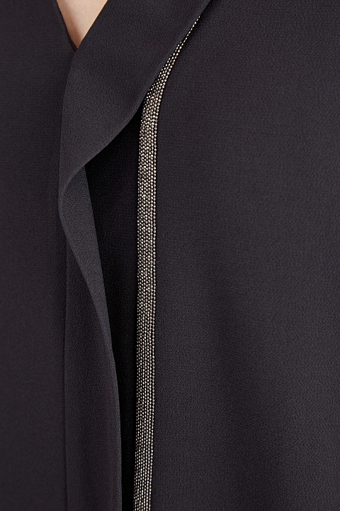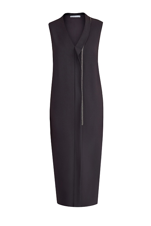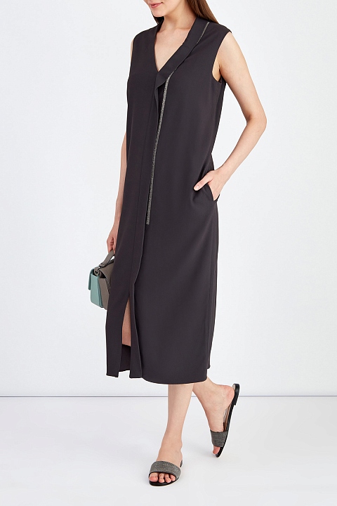 Элегантное платье от Fabiana Filippi выполнено из струящейся ткани со слегка неоднородной текстурой. V-образная пройма горловины подчеркнута асимметричной планкой и вручную расшита рядами мерцающих бусин. Внутренняя подкладка обеспечивает посадку по фигуре. Прорезные карманы завершают дизайн. Сделано в Италии.