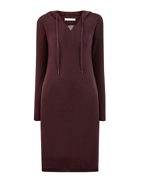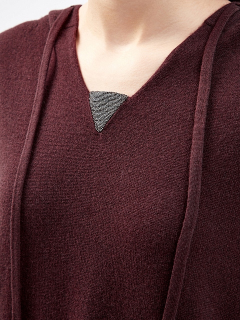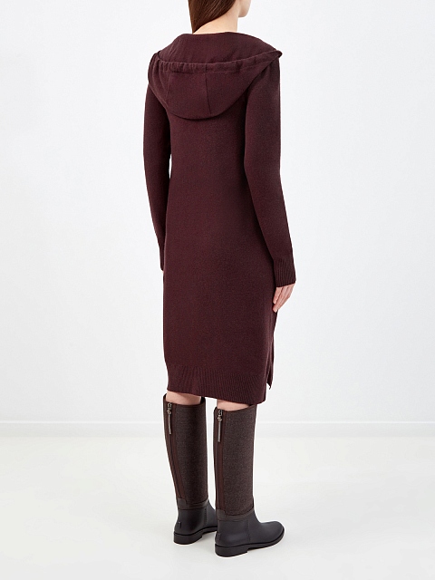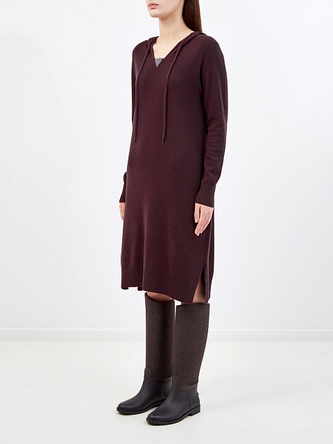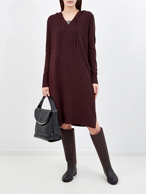 Платье-миди от Fabiana Filippi выполнено в оттенке бордо из пряжи Platinum на основе шерсти мериноса, кашемира и шелка. Объемный силуэт не стесняет движений, а капюшон на кулиске идеально подходит для создания образов в стиле спортшик. Детали: вышивка из мерцающих бусин, манжеты и нижний край в рубчик, разрезы по нижнему краю. Сделано в Италии.