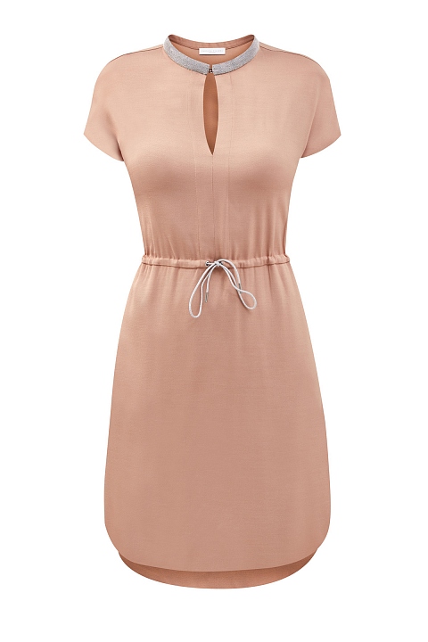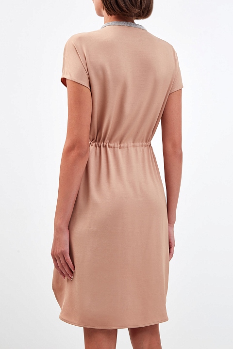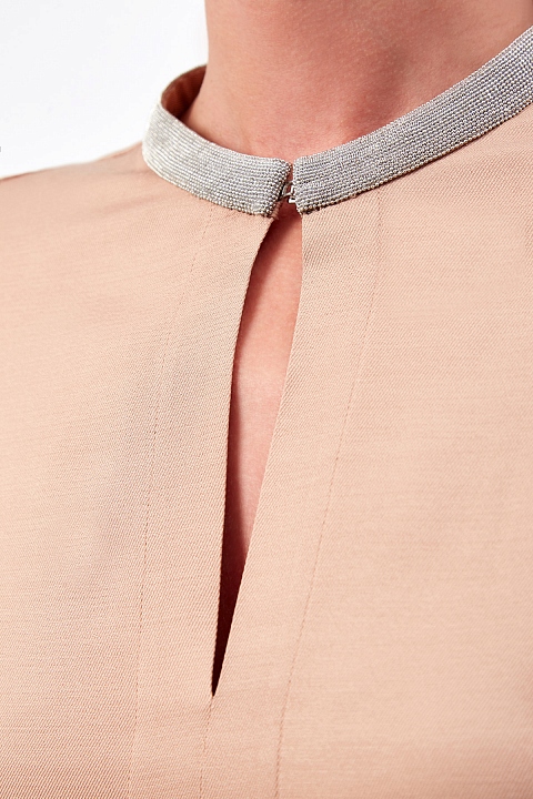 Лаконичное платье в стиле спортшик от Fabiana Filippi выполнено из струящегося вискозного твила с характерной диагональной текстурой. Акцент на талии создан при помощи потайной кулиски. Матовая поверхность материала оттенена блестящей отделкой ворота — выполненной вручную вышивкой из бусин ювелирной огранки. Расслабленный силуэт дополнен цельнокроеными рукавами и разрезами по бокам. Детали: прорезные карманы, застежка-молния на спинке. Сделано в Италии.