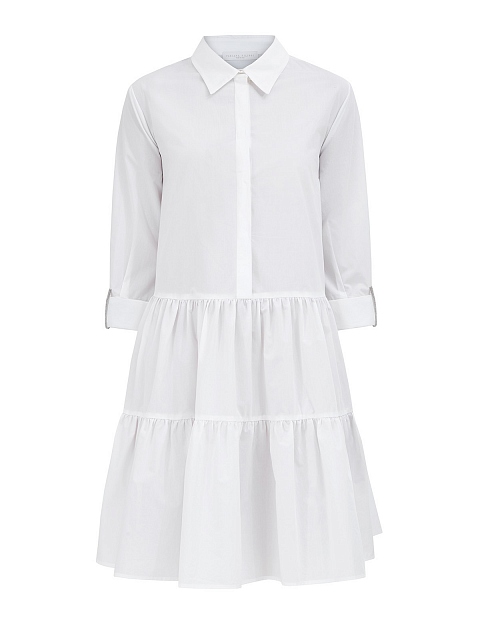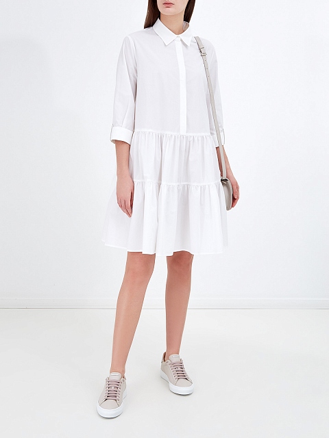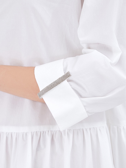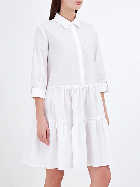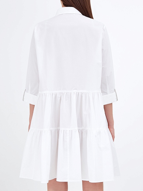 Легкое платье-рубашка от Fabiana Filippi. Для создания модели был выбран хлопковый поплин — натуральный материал с воздушной текстурой идеально подходит для летнего сезона. Однотонное исполнение делает модель неотъемлемой частью базового гардероба, пышный подол с оборками и ювелирные цепочки на манжетах завершают дизайн. Сделано в Италии.