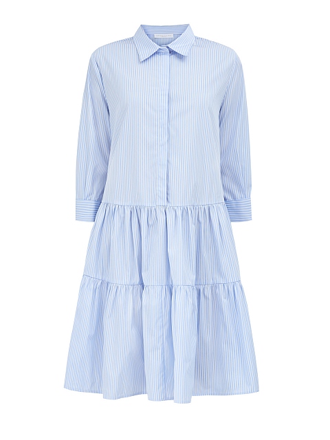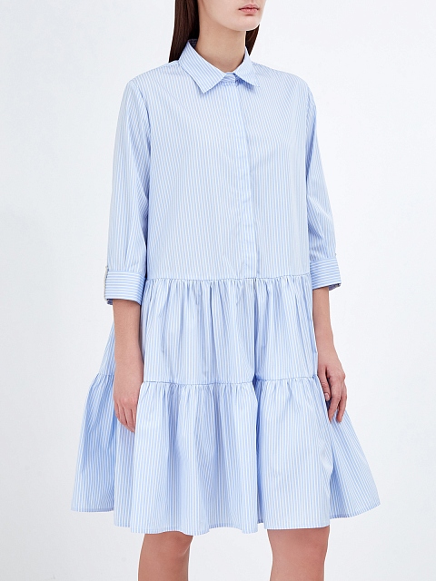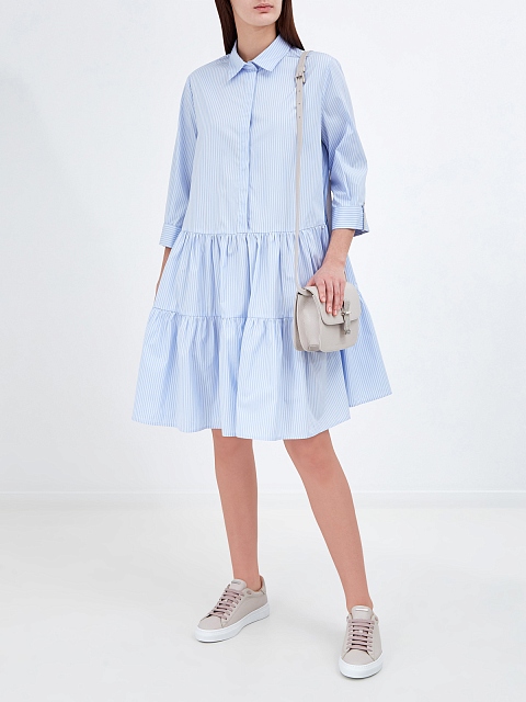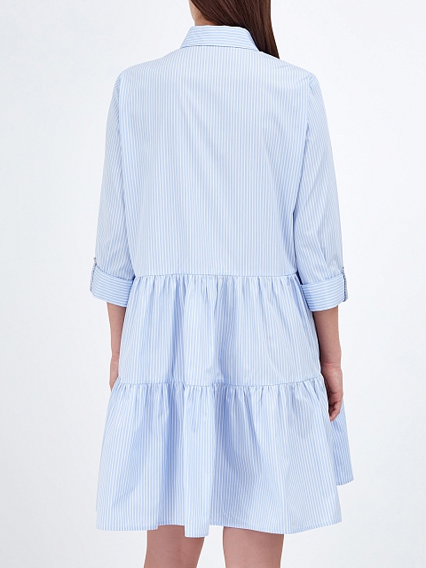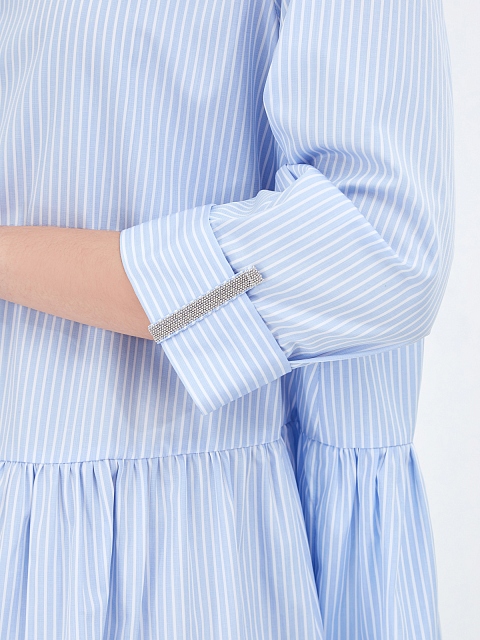 Легкое платье-рубашка от Fabiana Filippi. Для создания модели был выбран тонкий хлопковый поплин — натуральный материал с воздушной текстурой идеально подходит для летнего сезона. Принт в универсальную бело-голубую полоску делает модель неотъемлемой частью базового гардероба, объемный подол с оборками и ювелирные цепочки на манжетах завершают дизайн. Сделано в Италии.