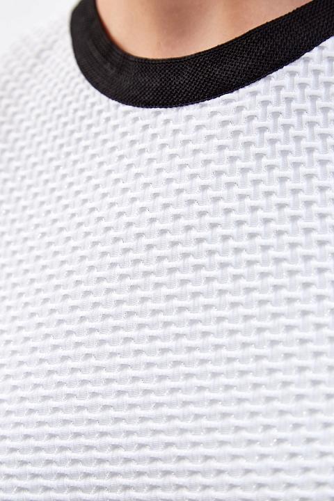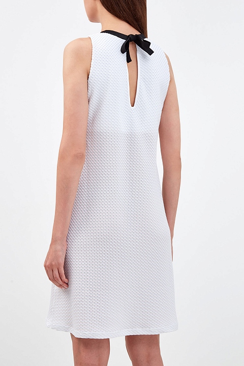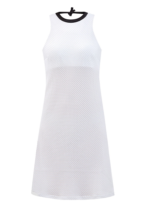 Короткое платье из коллекции Beachwear от Fisico выполнено в белоснежном оттенке из эластичной микрофибры. Фактурный материал с гладкой подкладкой на лифе обеспечивает максимальный комфорт и идеально подходит для пляжных аутфитов. Трапециевидный крой не стесняет движений, а декоративная прострочка серебристой нитью придает образу расслабленный акцент. Ворот изделия оформлен контрастной репсовой лентой в черном цвете, которая продолжена завязками на спинке в тон. Детали: круглый вырез горловины, модель без рукавов.