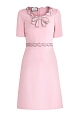 Женское платье в романтическом стиле из весенне-летней коллекции Gucci выполнено из эластичной вискозы в нежном розовом оттенке. Модель вдохновлена стилем 60-х годов: декор изысканной переплетающейся отделкой по вырезу декольте и на талии, а также фактурной аппликацией в виде банта с цепью кристаллов по кромкам создает настроение эпохи Возрождения. Изделие застегивается на потайную молнию на спинке и дополнено выточками, которые обеспечивают идеальную посадку по фигуре. Сделано в Италии.