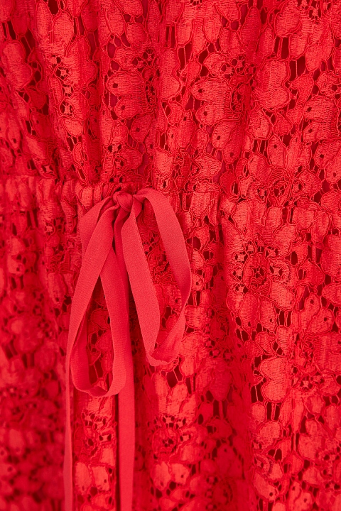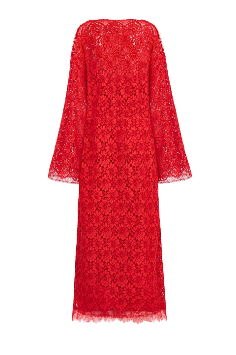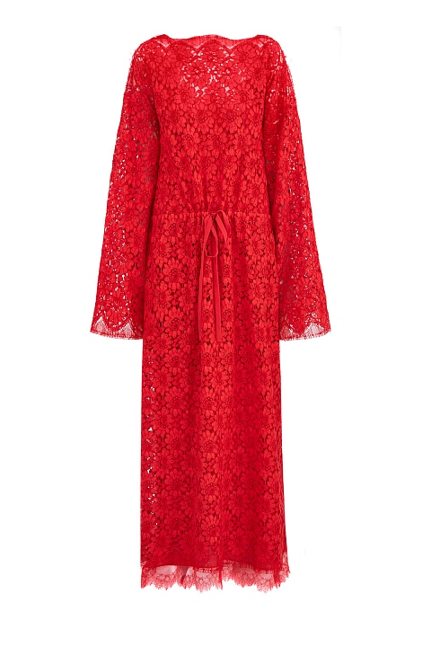 Изящное платье-макси от Gucci создано в богатом алом оттенке из кружевного полотна Rebrodé, ставшего символом эпохи Ренессанса. Расслабленный крой вдохновлен образами культуры хиппи эпохи 60-х годов, а эластичная кулиска формирует приталенный силуэт в романтическом стиле. Детали: овальная пройма горловины, внутреннее платье-комбинация из струящегося шелка, длинные рукава. Сделано в Италии.